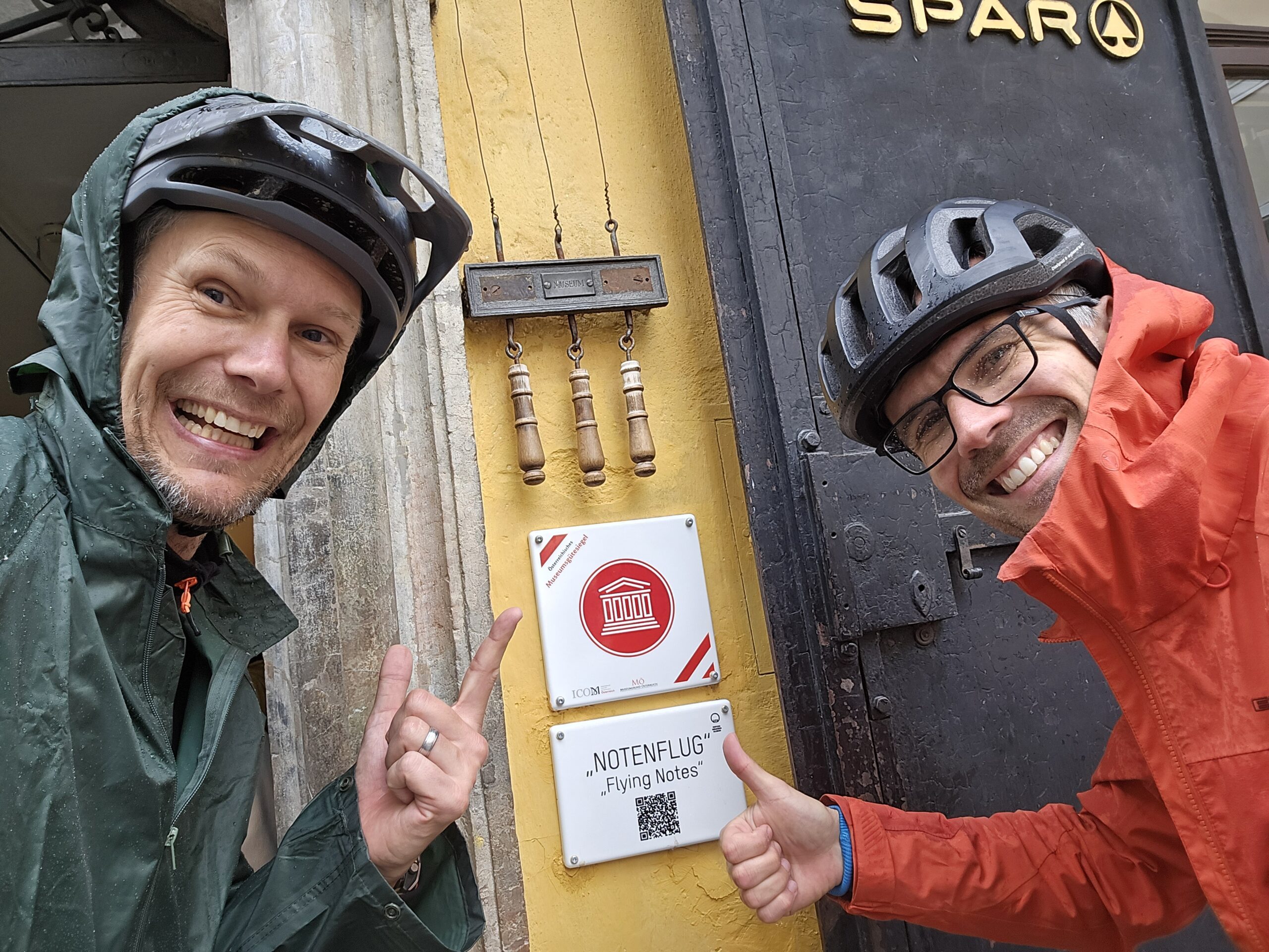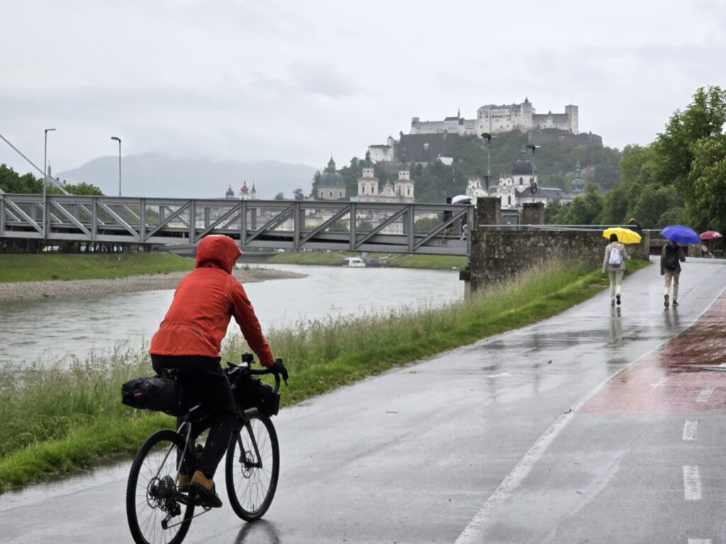 Tak se taky stalo a David nás vysadil hned pod dálnicí na severu města. Déšť neustával a bylo jasné, že nás bude doprovázet celý den na zhruba 110 kilometrech až do Bad Gasteinu, kde jsme měli zajištěné přespání u přátel v apartmánu. Přes město jsme se projeli po takřka liduprázdném nábřeží, abychom se na chvilku podívali k Mozartovu domu a na náměstí. Záhy jsme se vrátili k řece a pokračovali na jih do teplých krajin.