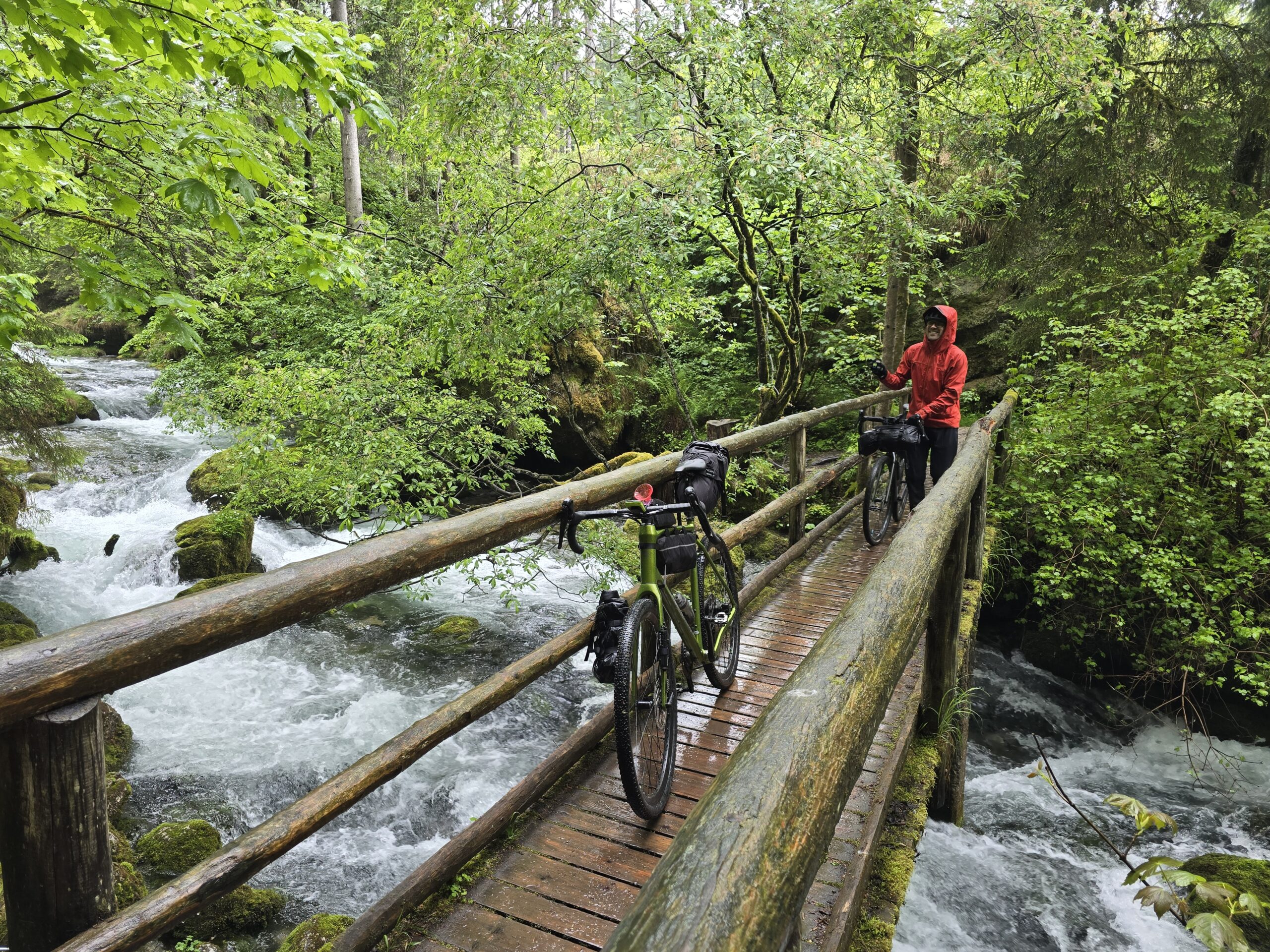 Ale začněme od začátku: je druhá půlka května, šest ráno a už nasedáme s Filipem v Břeclavi do Trail Hunter káry směřující do Salzburgu. David zde má vlastní plány s rovnými řídítky, nám se ale vzadu vezou dvoje berany: Merida Silex 400 v krásné zelené metalíze, a sice usedlejší, ale o to vznešenější karbonová Merida Silex 7000. Tyhle dva stroje ověšené brašnami nám budou další tři dny dělat společnost a společnými silami absolvujeme trasu z hor až k moři. Ač je cesta skvěle značená, vzali jsme navigaci na kolo Bryton s nahranými GPX soubory.