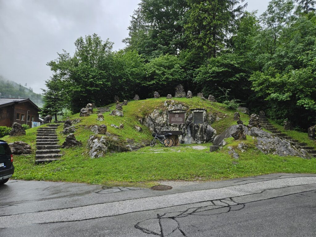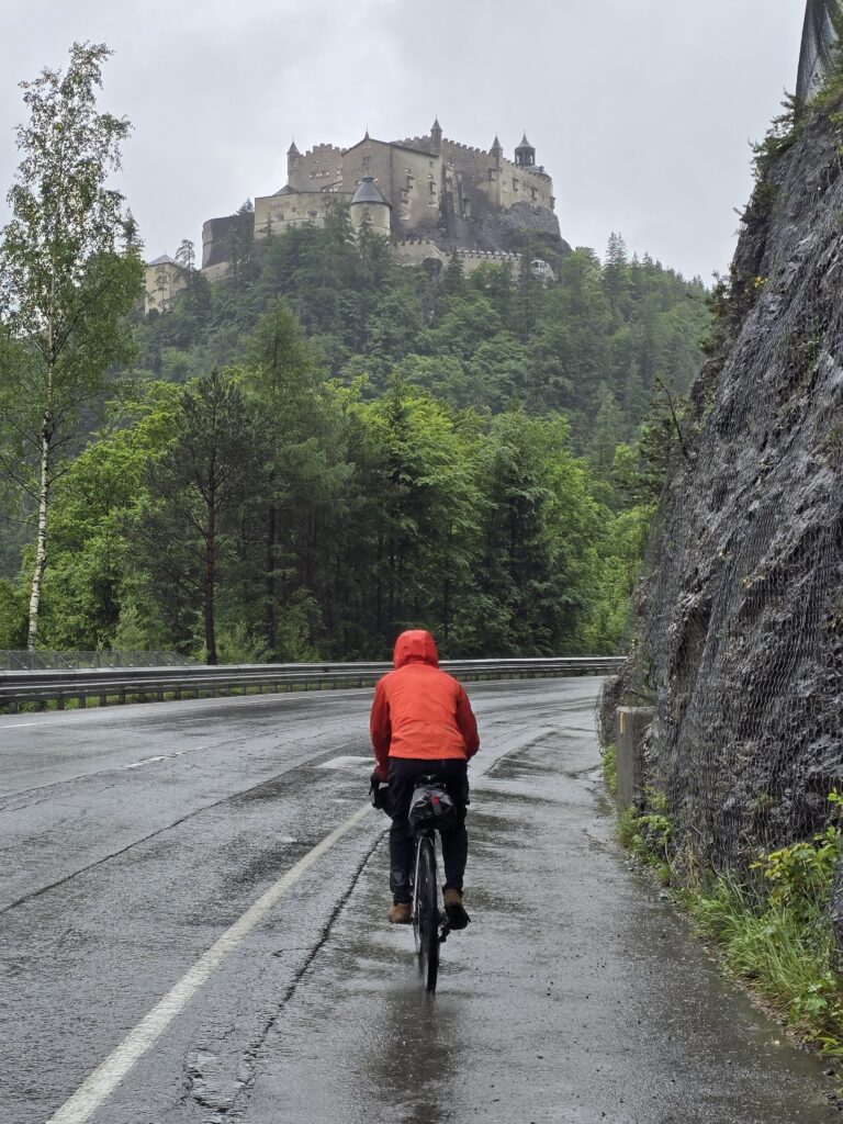 Následoval příjezd do Golling an der Salzach a pak cesta do sedla Pass Lueg. Hned po sjezdu ale krásná a doposud od provozu zcela vyloučená cyklostezka mizí a musíte na silnici. Naši situaci znepříjemňuje déšť a místy je silnice opravdu úzká. Tato nepříjemnost trvá asi 15 kilometrů do obce Werfen se slavným hradem na kopci, kde se mimochodem natáčel film Kam orli nelétají (mrkněte na Filmová místa.cz). Pojedete-li s dětmi, určitě tuto část vynechejte nasednutím na vlak v Gollingu a nechejte se popovézt minimálně do Werfenu. Zde jsme také vzali za vděk místní kavárnou/restaurací, kde se dodatečně omlouváme za zamokření polstrovaných židlí. Dali jsme si průměrný burger a nealko pivo, trudomyslnost jsme si nepřipouštěli: vždyť jsme byli na kole a celá cesta je před námi…