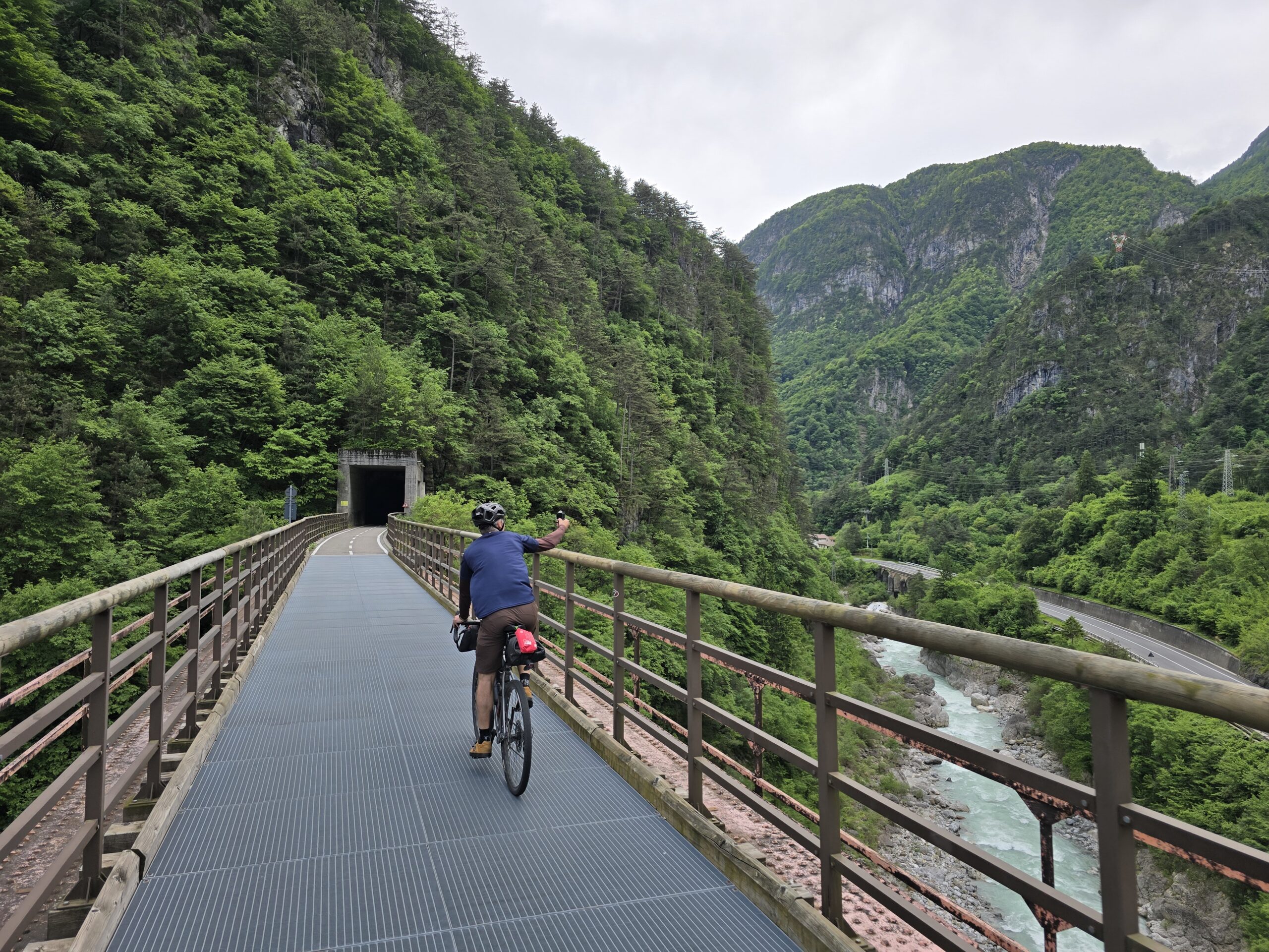 Železniční trať z Tarvisia do Udine přes Pontebbu byla vybudována koncem 19. století Rakousko-Uherskem jako hlavní spojení do severní Itálie. Vedla podél řeky Fella v náročném horském terénu, proto měla mnoho tunelů a viaduktů. Byla však jen jednokolejná, klikatá a pomalá, což postupně přestalo vyhovovat rostoucí dopravě. V 80. a 90. letech 20. století se proto začala stavět nová, dvoukolejná a rychlá trať s dlouhými tunely. Nová Pontebbana byla otevřena roku 2000 a stará trať byla oficiálně zrušena. My cyklisté máme ohromné štěstí, že takřka kompletní původní železnice byla přebudována na cyklostezku Alpe Adria a právě toto je její nejatraktivnější část. Původně trať vedla až do Udine a měřila 95 kilometrů, dnes z ní projedeme zhruba 65 kilometrů. Ale jsou to kilometry, které se nám vryjí do paměti.