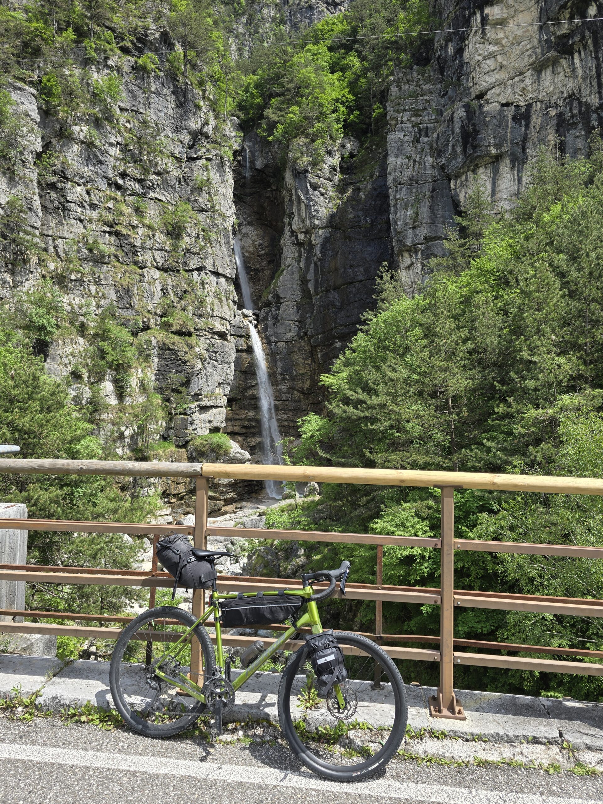 Trasa ubíhala a asfalt střídala šotolina. Tolik k časté otázce, zda lze trasu absolvovat na silničním kole. Nedoporučil bych to, šotolinových cest bylo po trase přece jen dost, zejména v Itálii pak zhrubnou, a rychlostní zisk úzkých plášťů určitě nevyváží rizika defektu a výrazně horší komfort.