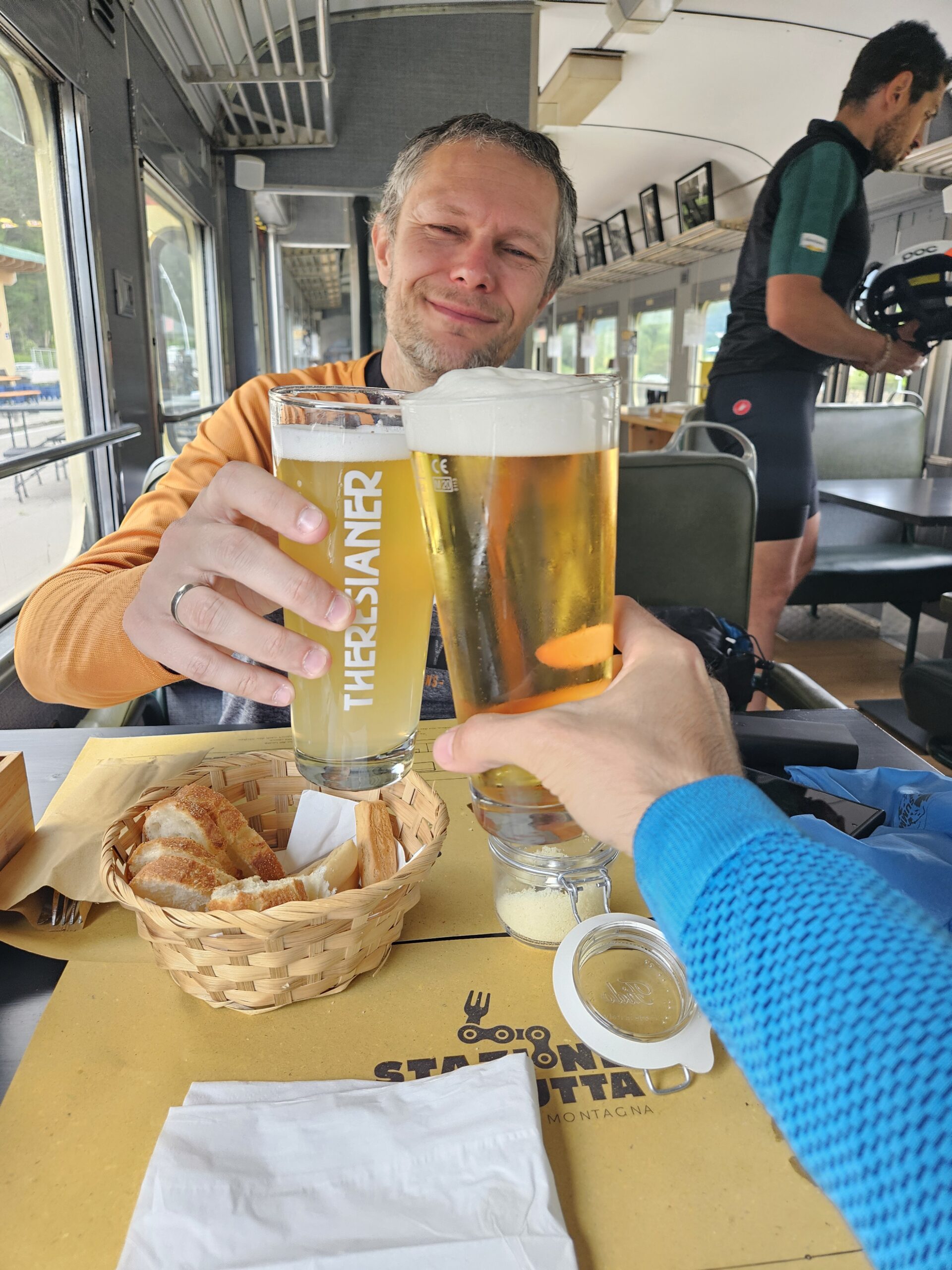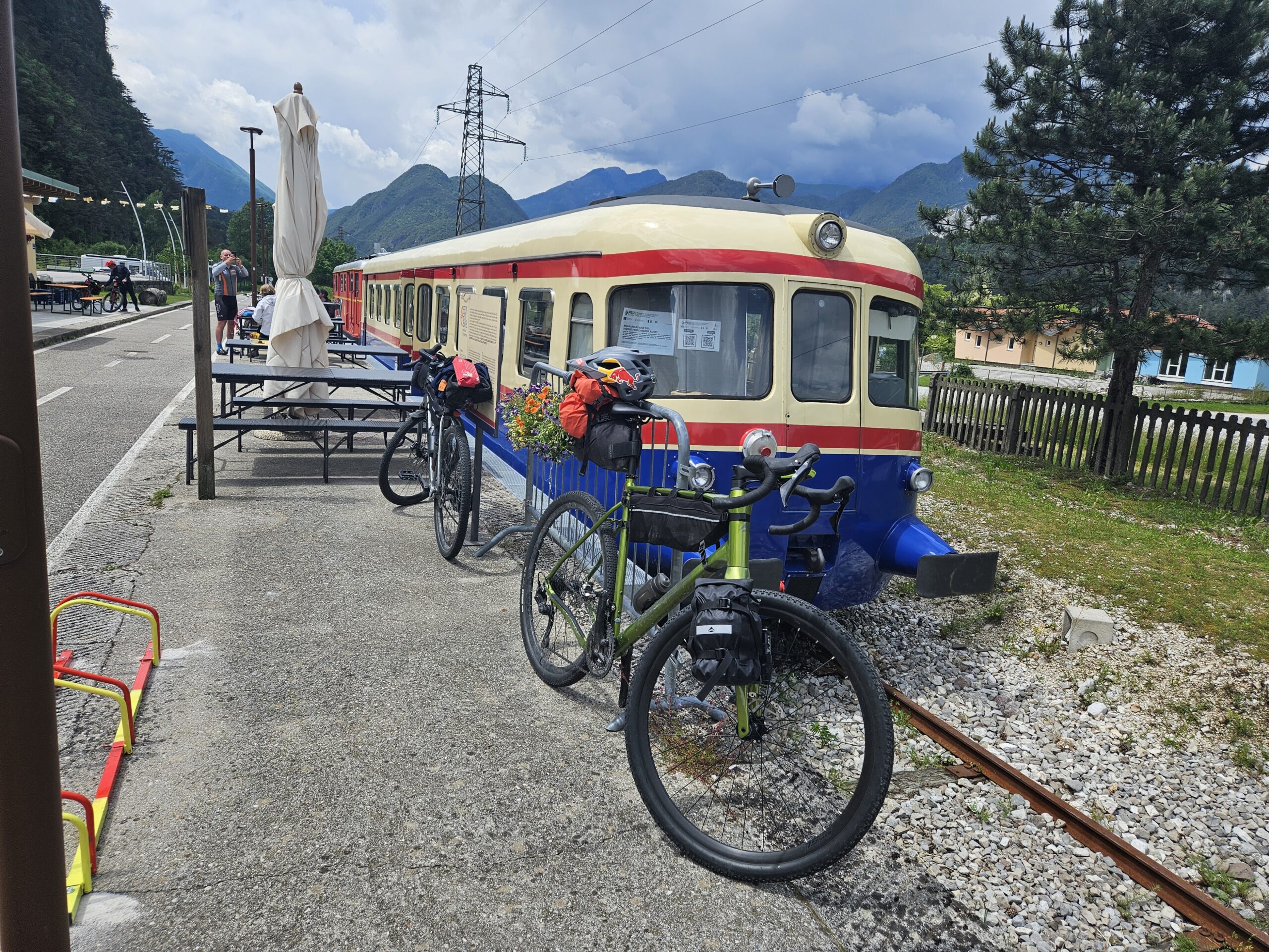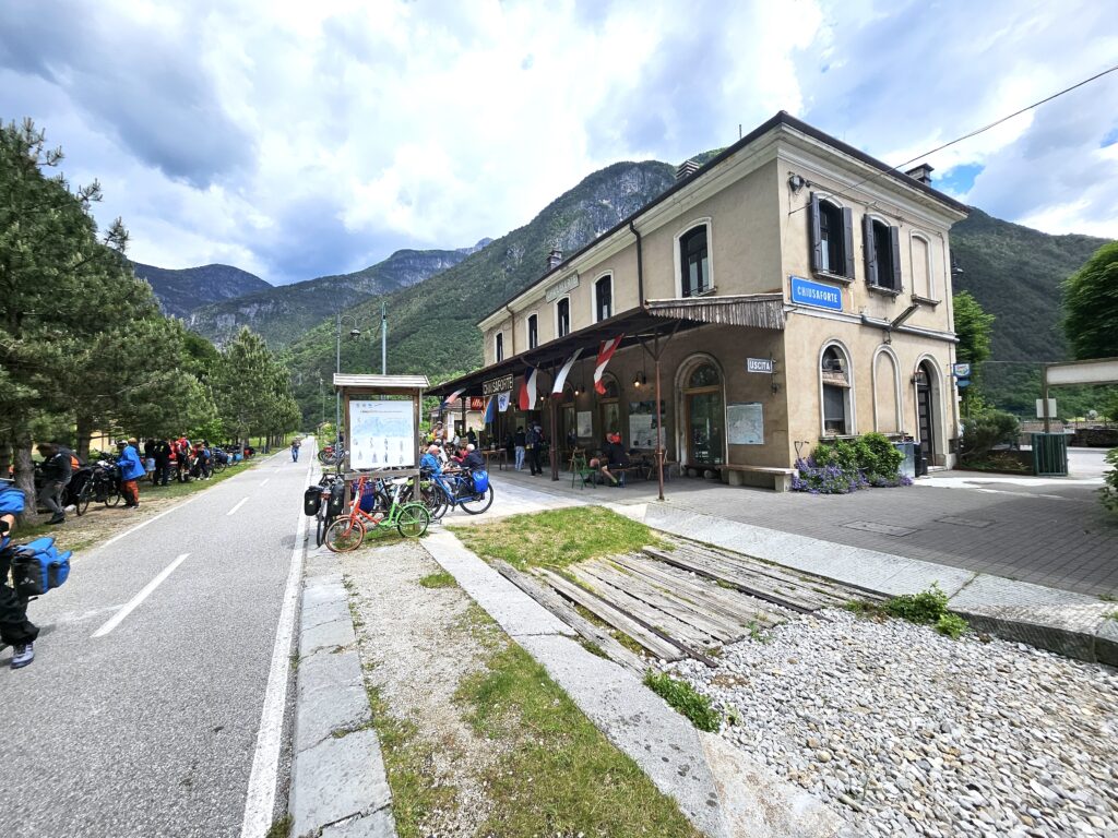 Jedním z ikonických míst je vlaková stanice Stazione di Chiusaforte, kde se zastavuje většina účastníků. Jsou zde na zdech hezké fotografie z dob budování této trati. Jídlo vypadalo skvěle, atmosféra báječná, jen zde na nás bylo už docela dost lidí a v hlavní sezónu to bude jistě ještě horší.