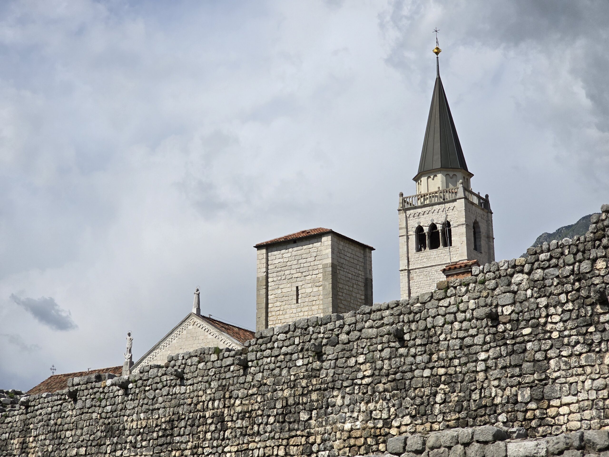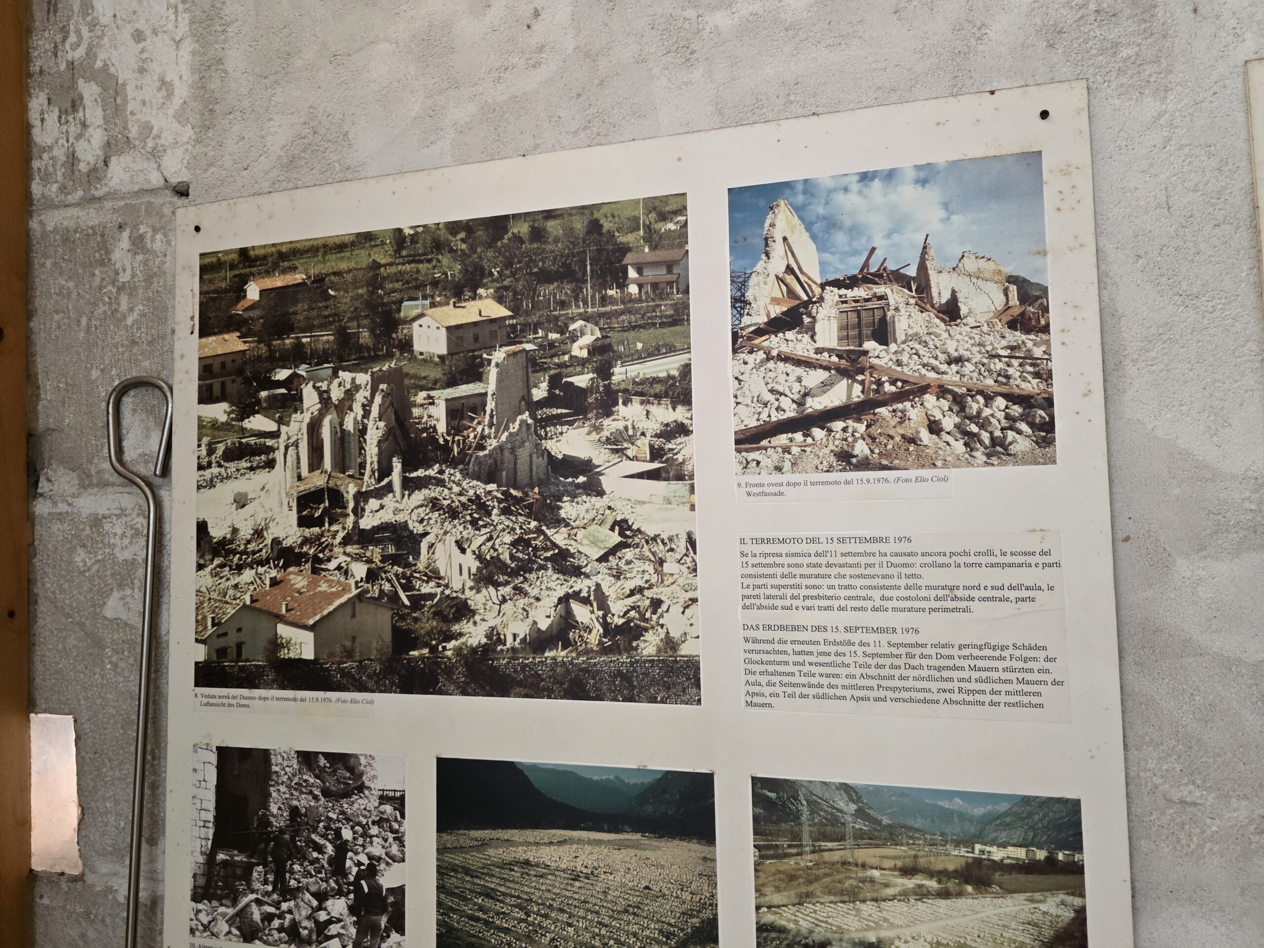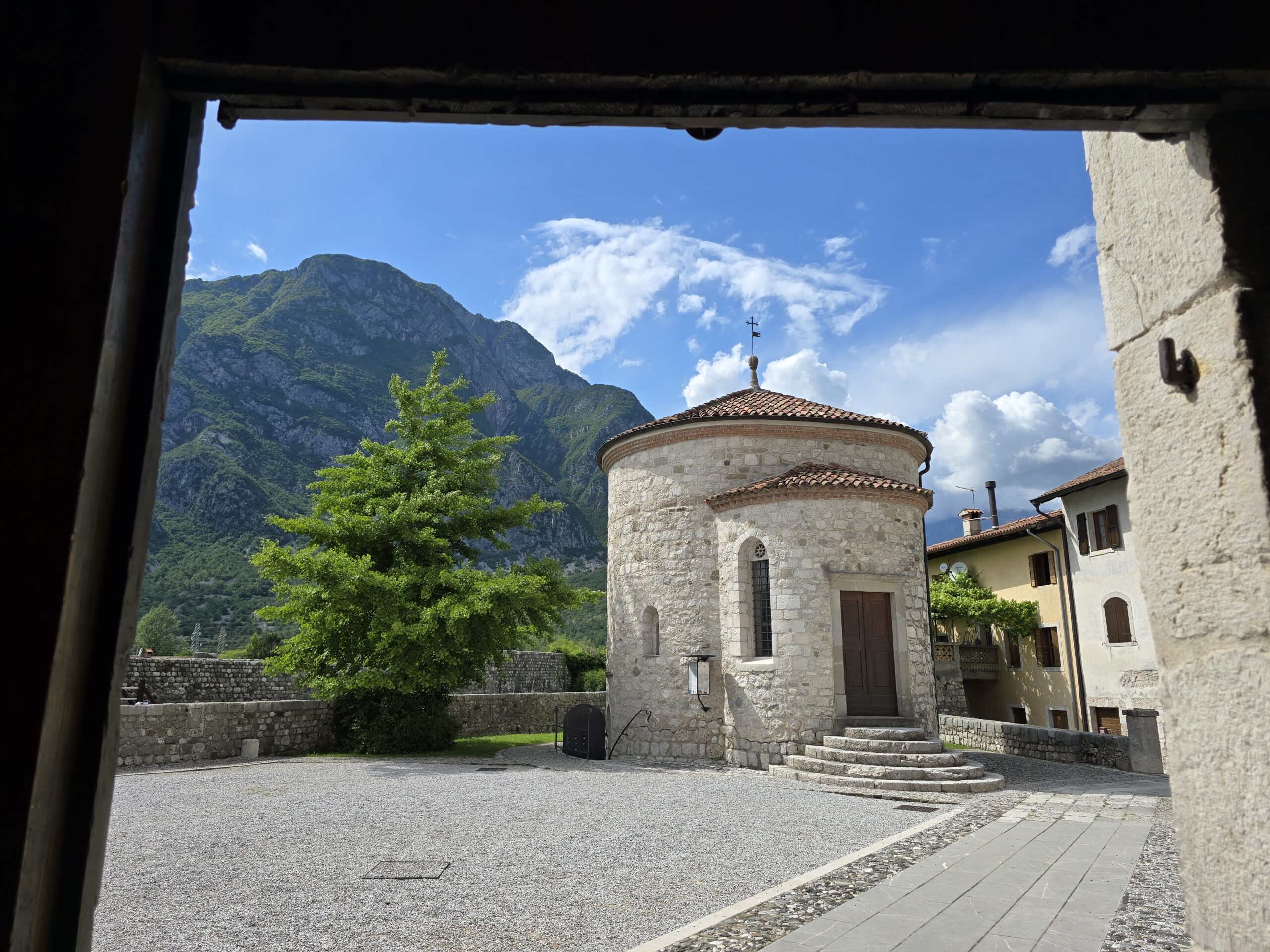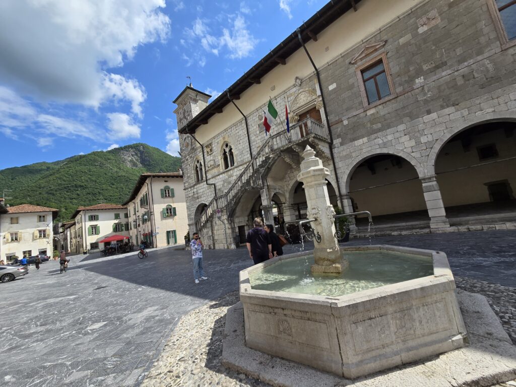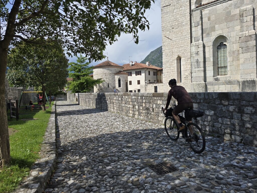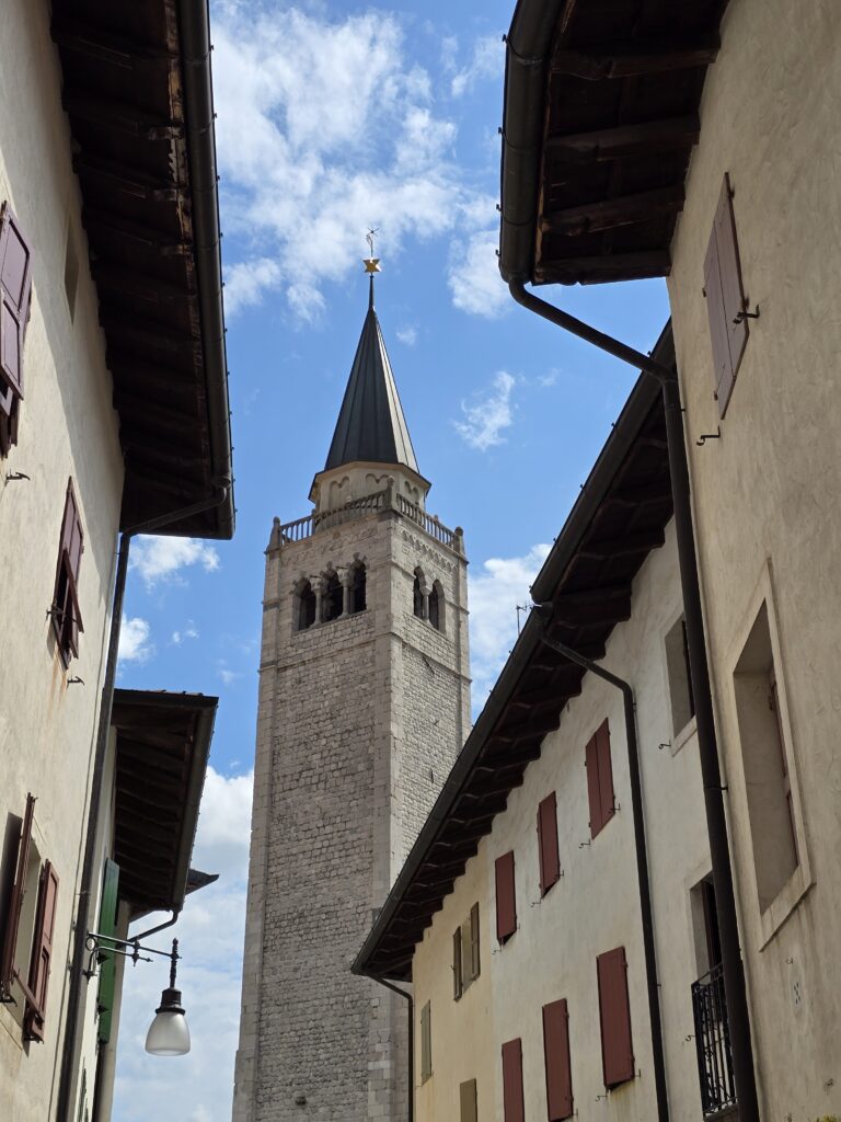 Krásná trasa trvala ještě pár kilometrů a končí v obci Carnia, kde se trasa ztrácí a chvíli jedeme pár kilometrů s místním provozem. Do cesty se nám staví malé historické městečko Venzone ležící u řeky Tagliamento mezi horami Julských Alp. Proslavilo se jako jedno z nejkrásnějších středověkých měst severní Itálie a celé jeho historické centrum je obehnáno hradbami. V roce 1976 bylo Venzone silně poničeno ničivým zemětřesením, ale díky pečlivé rekonstrukci bylo znovu vystavěno do původní podoby. Dominantou je románská katedrála San Andrea s unikátně obnoveným interiérem. Obec je známá také tzv. „mumifikovanými těly“ uchovávanými v kryptě, která se stala turistickou atrakcí. Návštěvu jsme stihli, o mumiích jsme bohužel nevěděli. Naproti katedrály jsme si dali kafíčko na posilněnou s vědomím, že to do Udine máme ještě nějakých 40 kilometrů.