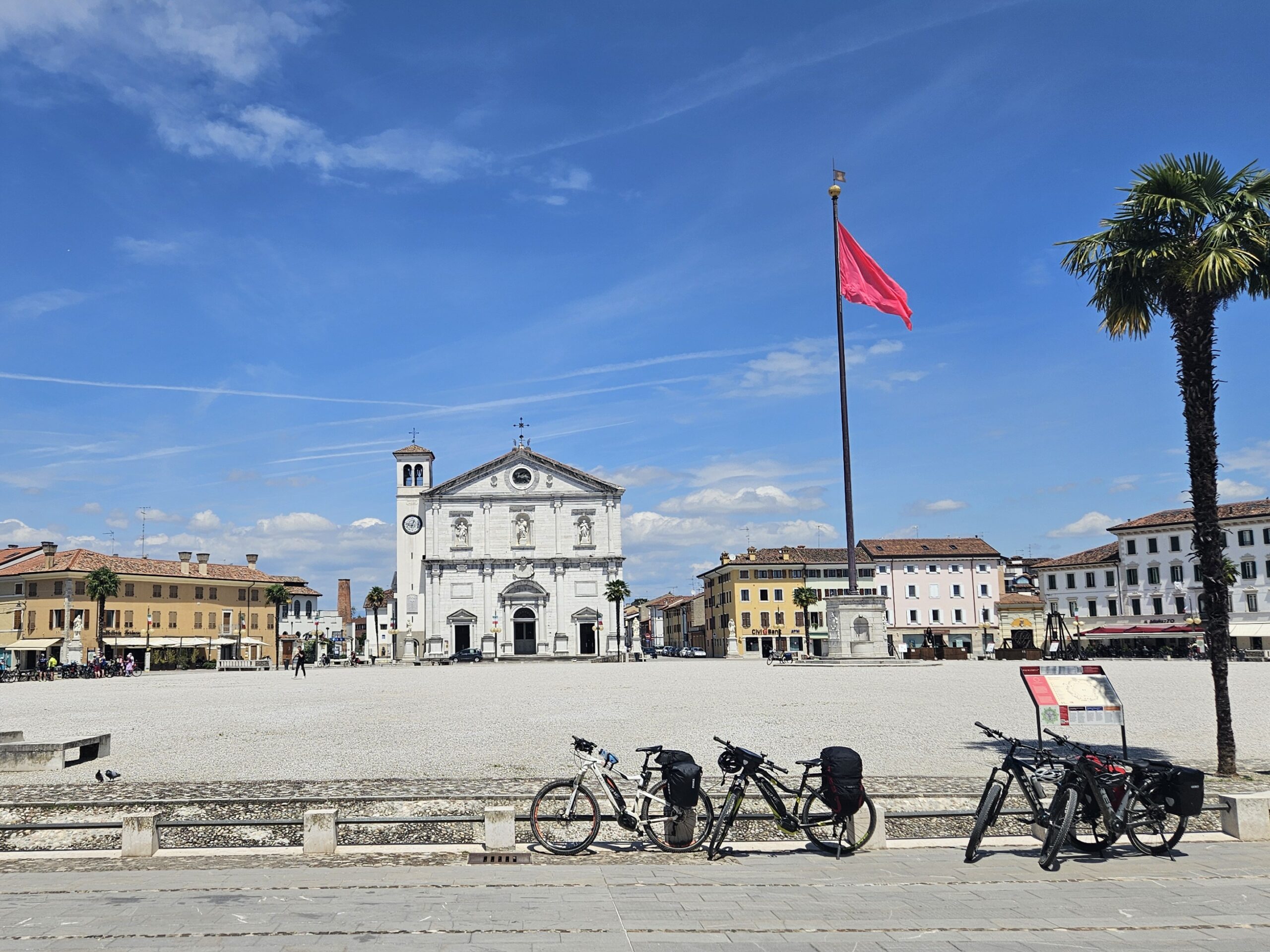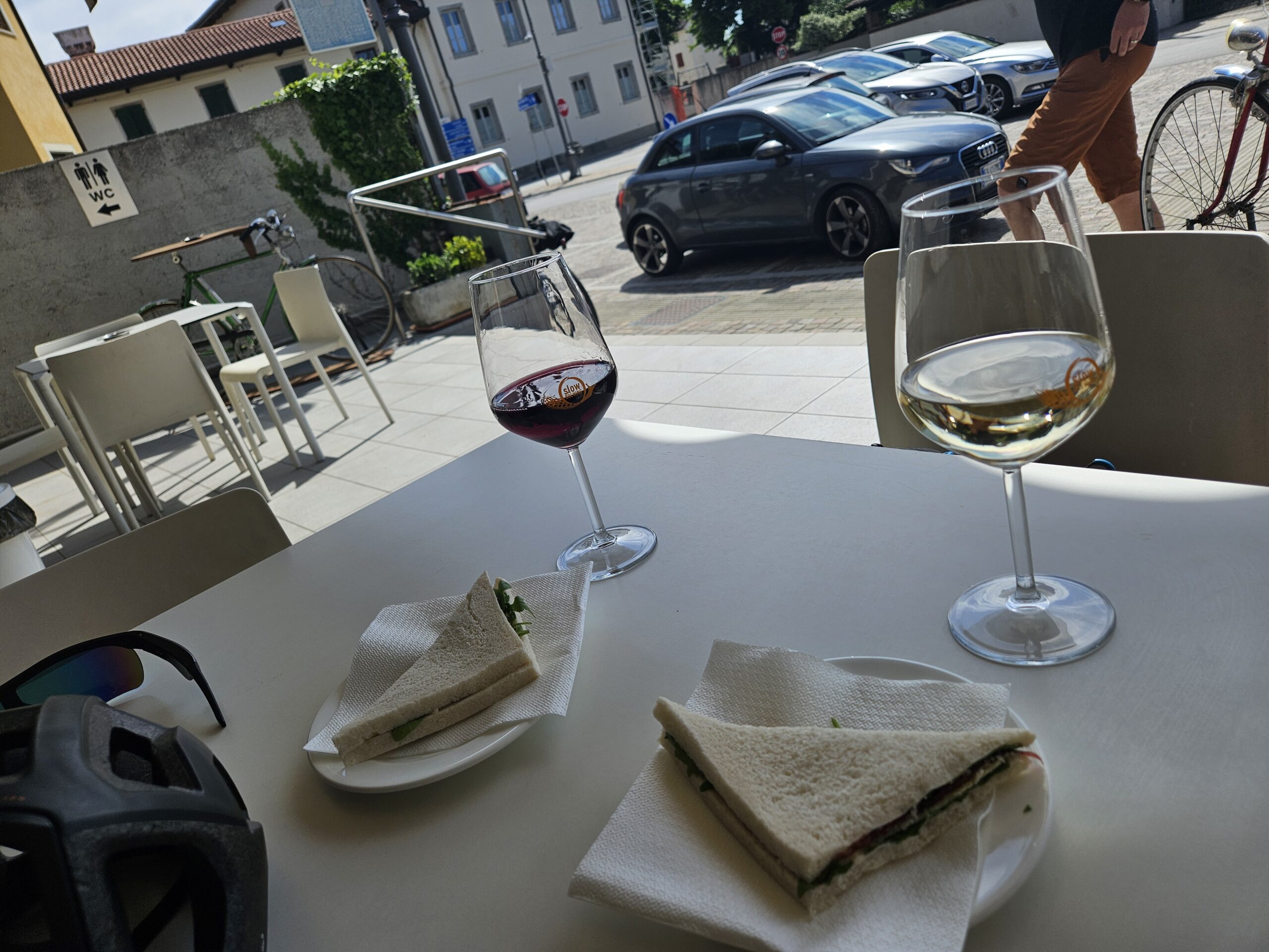 Navigace nám ukazovala pouhých 64 kilometrů a David měl přijet až ve 14:00, a tak jsme nikam nespěchali. Vrátili jsme se do centra Udine, zašli do Cattedrale di Udine, objeli si park Giardin Grand a napojili se na trasu. Cesta začala být poměrně monotónní, ale zpestřili jsme si ji zastávkou v klasickém italském baru De Nardo Gualtieri, kde se v nedělní dopoledne místní schází na sklenku vína, cigaretku, probrat politiku a podobně. Konečně jsme si dali sklenku osvěžujícího bílého a červeného vína „de la cassa“ a tousty k tomu. Pobavili jsme se s dalšími cyklisty na silničkách a vydali se na zbývající cestu.