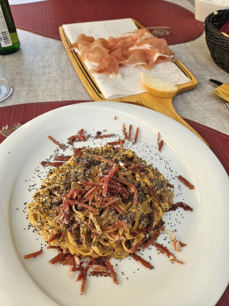 Pokračovali jsme do městečka Palmanova, které nás na mapě při cestách vždy zaujalo svojí pravidelností, ale nikdy jsme se tam na výletech do Itálie nestavili. To má člověk vždy napilno, přitom leží doslova pár kilometrů od dálnice a stojí za návštěvu. Zajímavé jsou původní hradby okolo kostela, náměstí je spíš takové prázdné, plné restaurací a kaváren. Stále máme dost času a konečně se zastavujeme na oběd, volba padla na Terra Madre 1891. Asi jsme byli odměněni za ten první den, ale špagety s místní šunkou a žloutky, byly ty nejlepší špagety, co jsem doposud jedl. Bohužel, recept se mi dle názvu nepodařilo najít.