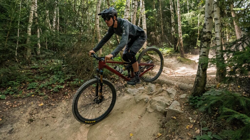 Co je z kola hned cítit je jeho kratší reach, ale hlavně hodně vysoko položená řídítka. Do prudšího kopce je trochu cítit i položenější sedlová trubka. Z kombinace těchto faktorů mám pocit, že sedím trochu víc vzpřímeně a vzadu. Ale díky delší zadní stavbě se kolo nemá tendenci stavět na zadní a vyškrábete se na něm i do strmého svahu.